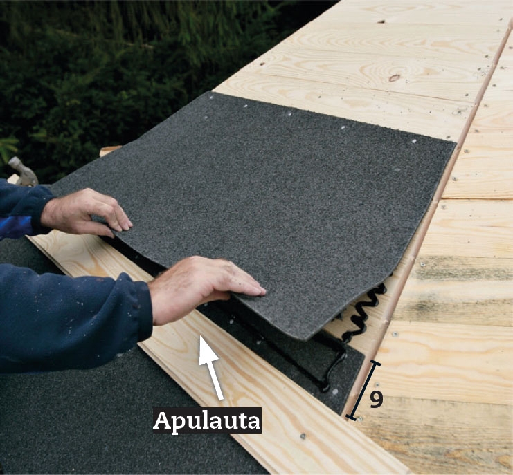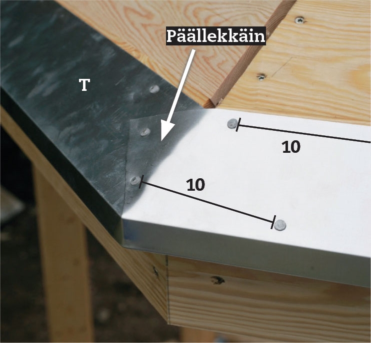 Käytä ohjainkiskoa pitkien kaistaleiden ohjaamiseksi ja naputtele kaistaleet kiinni puupalikan ja vasaran avulla. Nauloja tai liimaa ei välttämättä tarvita. Siisti räystäspellille (T) tuleva reuna.