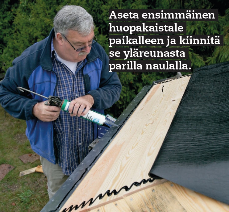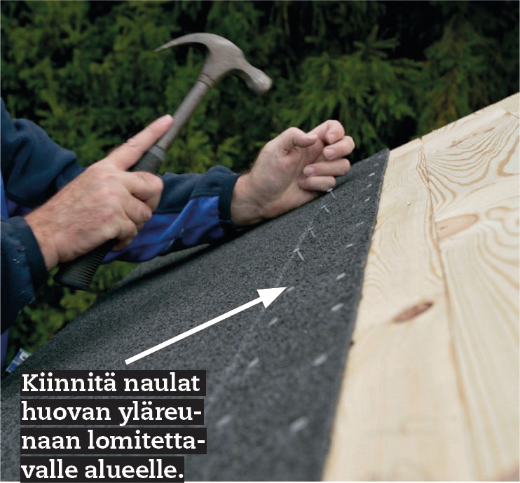 Naulaa kattohuopakaistale kiinni merkitsemiesi lomitusmerkkien kohdalta. Naulat sijoitetaan 10 cm:n etäisyyksin ja limittäin. Naputa koko pinta kiinni kattoon esim. puupalikalla ja vasaralla.