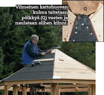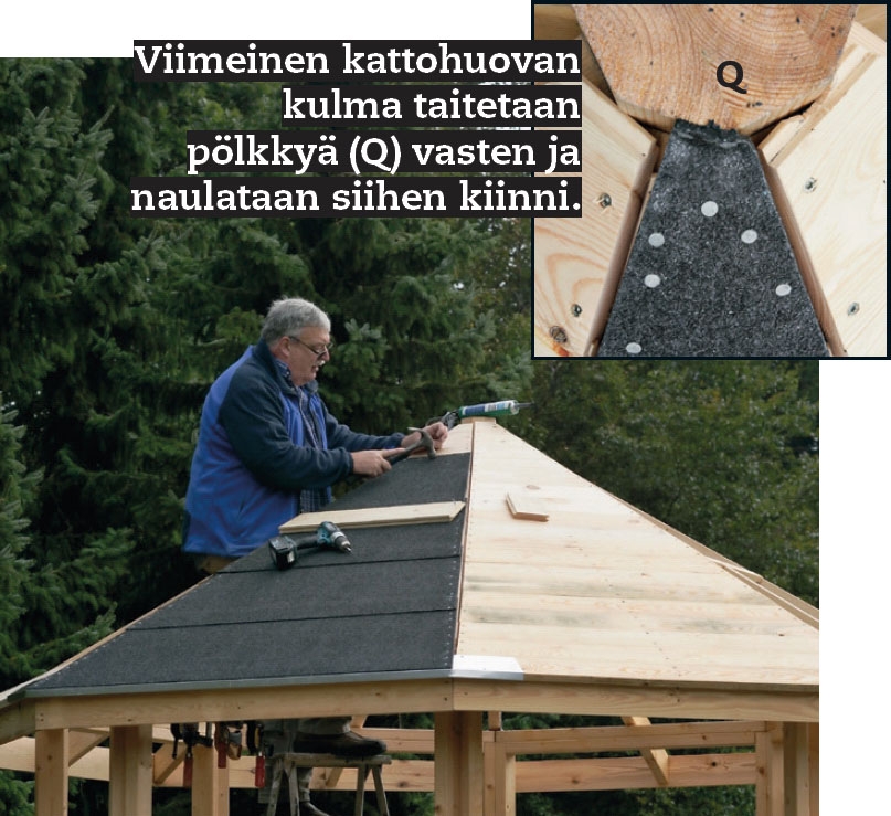 Tämän jälkeen voidaan ryhtyä katon verhoiluun. Laudat asennetaan vaakaverhoiluna sahapinta ylöspäin ja sileä pinta alaspäin. Näin kattohuopa kiinnittyy paremmin.