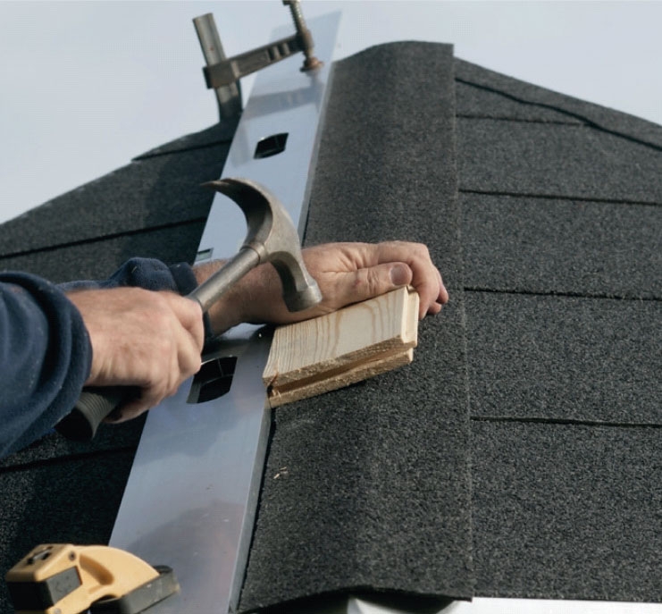 Reunaliimaa kattohuopa. Nosta kaistaletta vastanaulattua reunaa vasten ja vedä vana liimaa molemmille puolille sivuja ja pari vanaa alumiiniselle räystäspellille. Poista huovan suojakalvo.