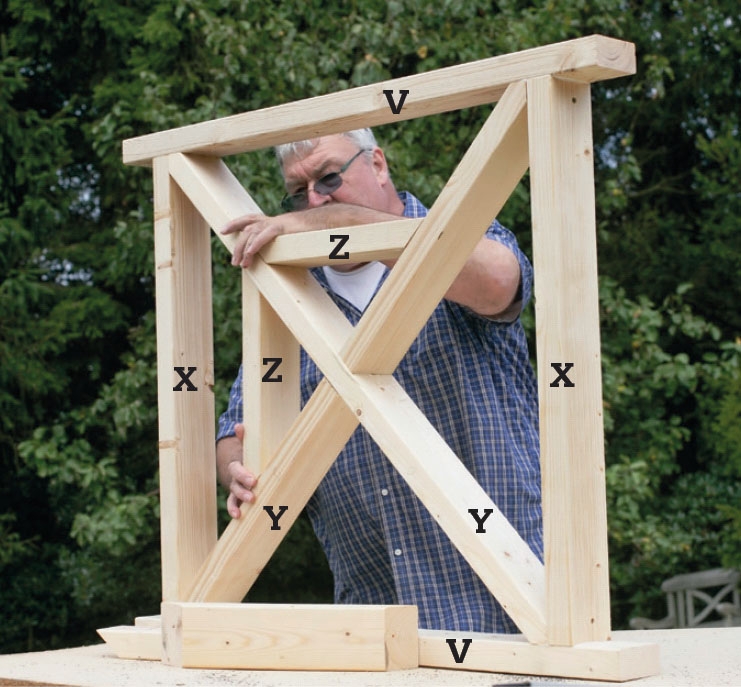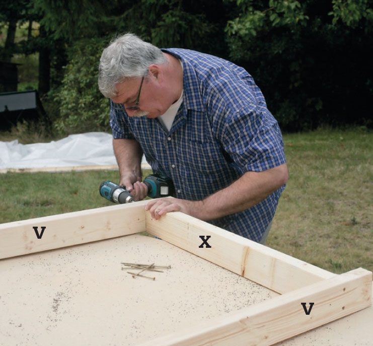 Kehys kootaan kahdesta vaaka-(V) ja pystylaudasta (X). Käytä 5 x 100 mm ruuveja ja vedenkestävää puusepänliimaa. Kyllästä kaikki päätypinnat liimalla, se estää niitä imemästä kosteutta.