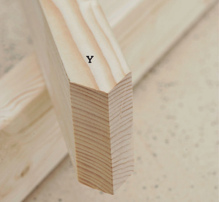 Merkitse ristikon vinopalkit (Y) kehyksen sisäkulmiin. Sahaa päätyihin kaksi 45°:n kulmaa, niin ne sopivat kehikon kulmiin.