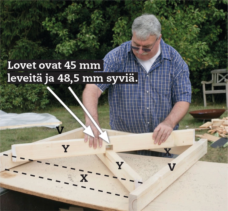 Kokoa kaiteiden ristikot (Y) loveamalla (liitosta kutsutaan hakaliitokseksi). Sahaa palkin keskelle kaksi viiltoa ja poista puuaines taltalla. Kokoa ristikko ja kiinnitä viimeinen pystylauta (X).