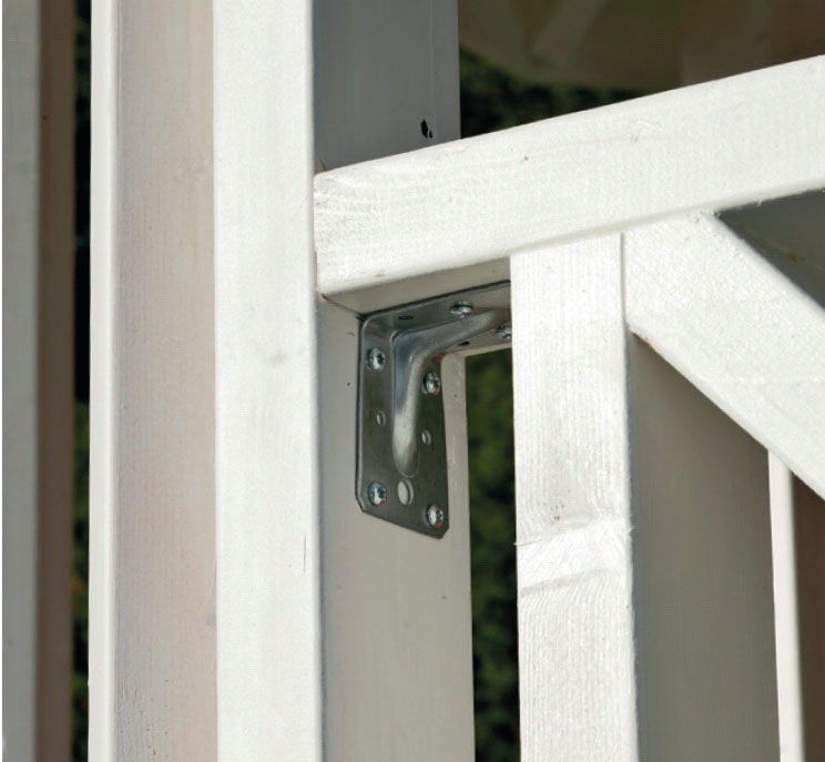 Paviljongin sivut voidaan kattaa monella tavalla. Osa pinnasta voidaan esim. peittää lovilaudoituksella ja työstää toisiin kohtiin tilaa ikkunalle ja ovelle. Me valitsimme avoimen kaiderakenteen. Ristikkokaide valmistetaan kahdesta vaaka- (V) ja kahdesta pystylaudasta (X). Jotta kuviosta muodostuisi neliömäinen kehys, painoimme nämä kaksi sivua 8 cm paviljongin tolppien sisäpuolelle. Näin keskelle syntyy harmoninen ristikko (Y). Ylimääräinen neljästä lauta-kappaleesta työstetty sisäkehys (Z) on pelkkä koriste.