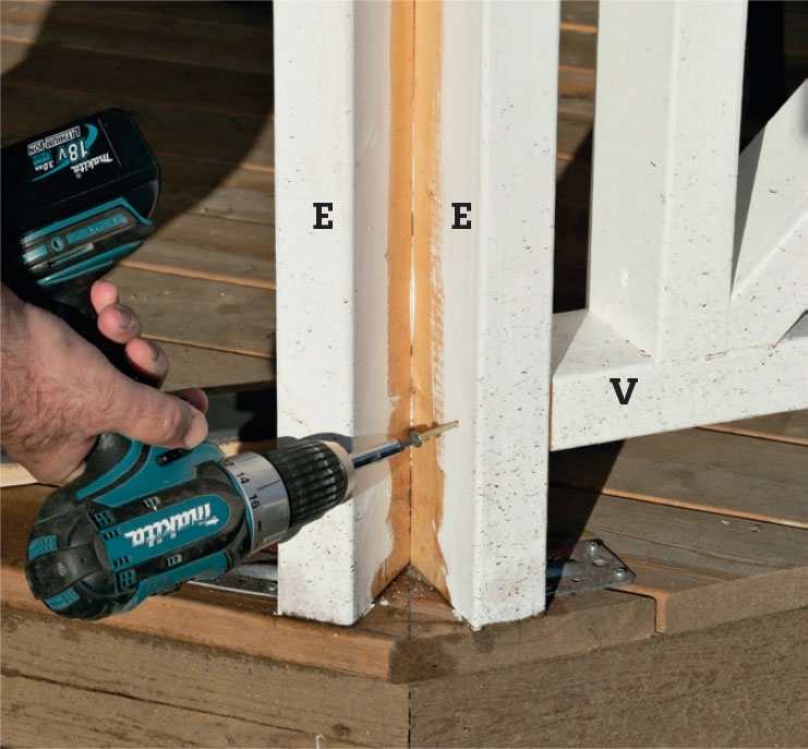 Kiinnitä kaiteen alimmat vaakalaudat (V) 5 x 100 mm ruuveilla kummaltakin puolelta päätypuuta, pystytolppien (E) läpi, ennen kuin kiinnität peitelistat tolppien liitoskohtiin.