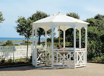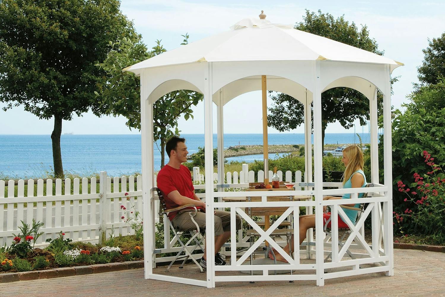Kun huvimaja on pystyssä, aseta vankka, painava varjonjalka - esimerkiksi betoninen - majan keskelle. Jos varustat majan meidän mallimme mukaan pyöreällä pöydällä, jossa on reikä keskellä auringonvarjoa varten, pystytä pöytä ennen kuin kiinnität auringonvarjon huvimajaan.