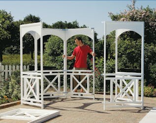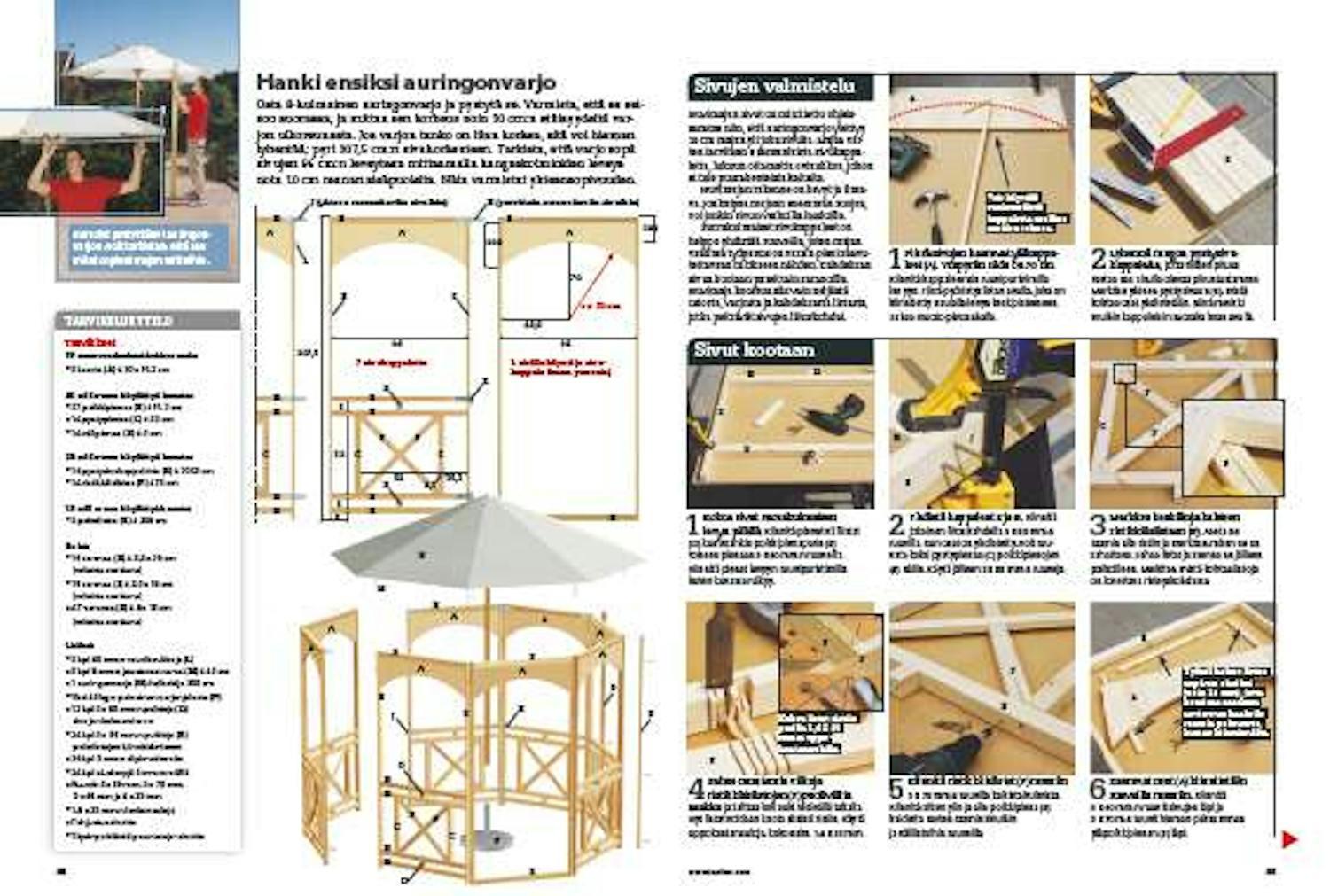 Suorakulmaiset sivukappaleet on helppo yhdistää ruuveilla, joten majan vaatima työpanos on varsin pieni saavu-tettavaan tulokseen nähden. Kahdeksan sivua kootaan pareittain saranoilla. Huvimaja koostuu siis vain neljästä osiosta, varjosta ja kahdeksasta listasta, jotka peittävät sivujen liitoskohdat.