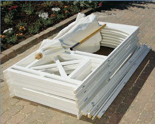 Huvimajan sivut on mitoitettu ohjeis-samme niin, että auringonvarjo ylettyy 10 cm majan yli joka sivulta. Majaa var-ten tarvitaan 8 samanlaista sivukappa-letta, lukuun ottamatta oviaukkoa, johon ei tule puurakenteisia kaiteita.