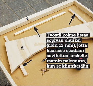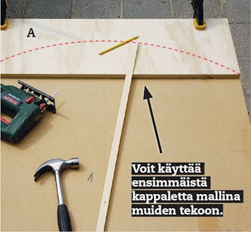 Piirrä sivujen kaarevat yläkappa-leet (A). Ympyrän säde on 70 cm. Kiinnitä kappale ensin ruuvipuristimilla levyyn. Piirrä pyöristys listan avulla, joka on kiinnitetty naulalla levyn keskipisteeseen. Sahaa muoto pistosahalla.