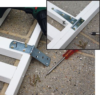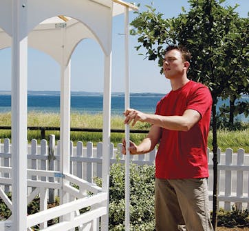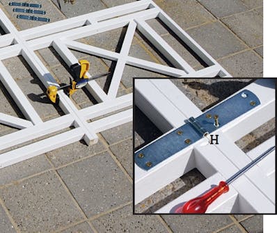 Kiinnitä kahdeksan peitelistaa (G) sivuliitoksiin. Listat viimeistelevät huvimajan upean ilmeen ja myös vakauttavat majan rakennetta.
