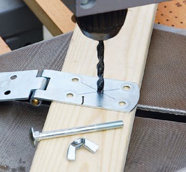 Pieniä saranoita (J) käytetään neljän raamiparin yhdistämiseen. Poraa ensin 5 mm:n reikä jokaisen saranan toisen lehden keskelle. Reikää tarvitaan, jotta voit työntää pultin siitä läpi ja kiristää sen siipimutterilla.