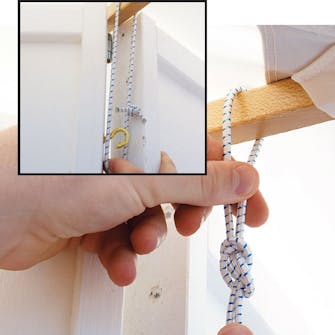 Kiristä varjon narut pystysivujen koukkuihin kiinni.