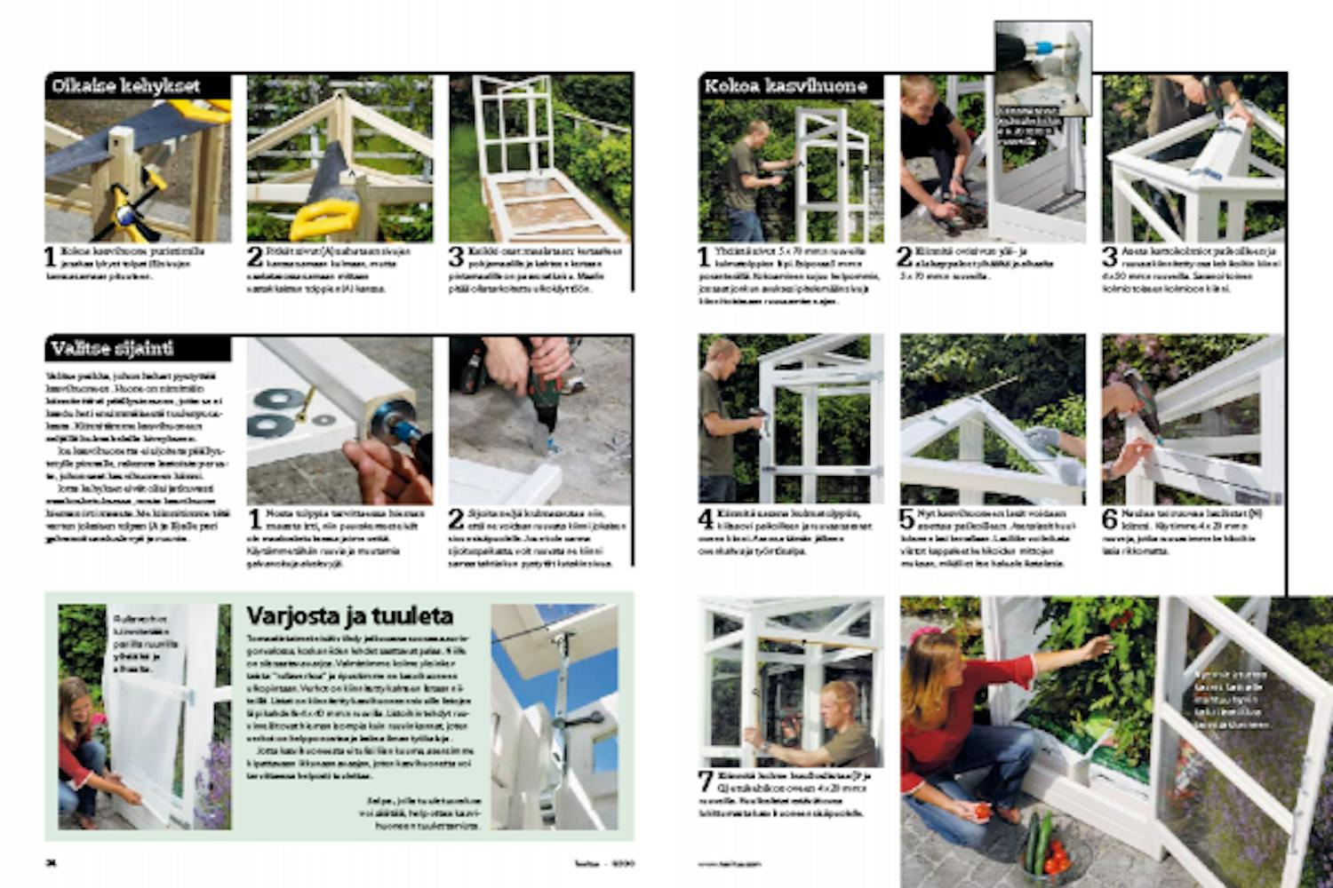 Seuraavan sivun listasta löytyvät kaikki materiaalit, jotka tarvitset. Koska koko kasvihuone rakennetaan listoista ja lau-doista, suosittelemme, että noudat kaikki materiaalit kotiin ylipitkinä, siis hieman annettuja mittoja pidempinä, jotta voit sovittaa ne työn edetessä.