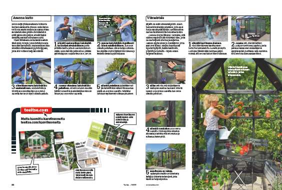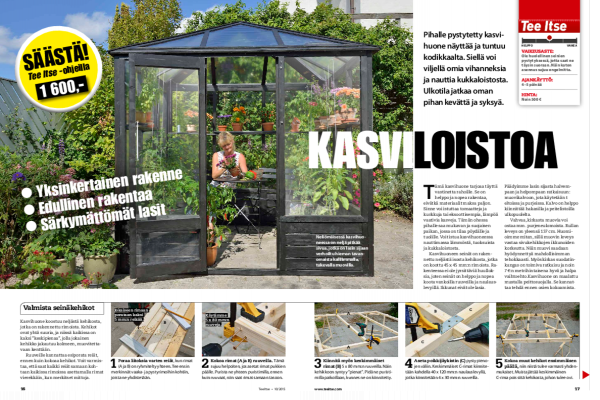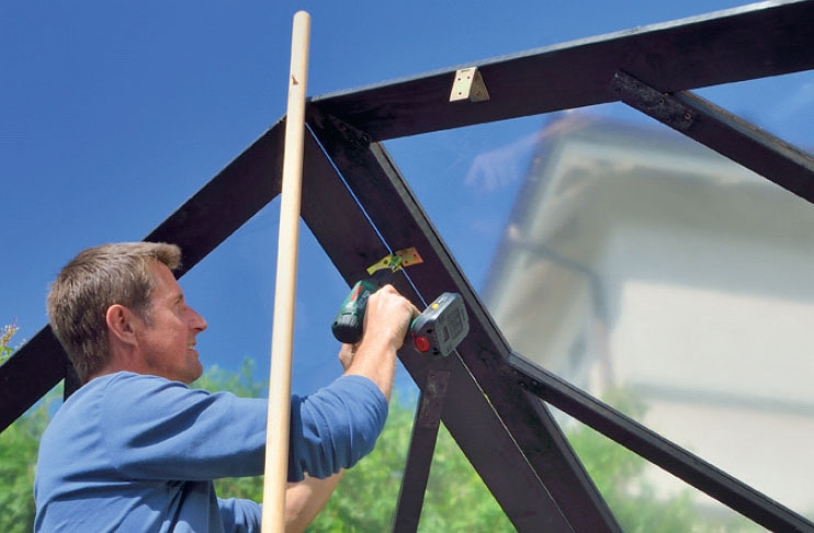 Jäljellä on enää viimeistelytöitä. Kasvi-huone kiinnitetään alustaan, jotta se ei horju myrskysäälläkään. Me kiinnitäm-me sen kulmaheloilla betonilaattoihin.
