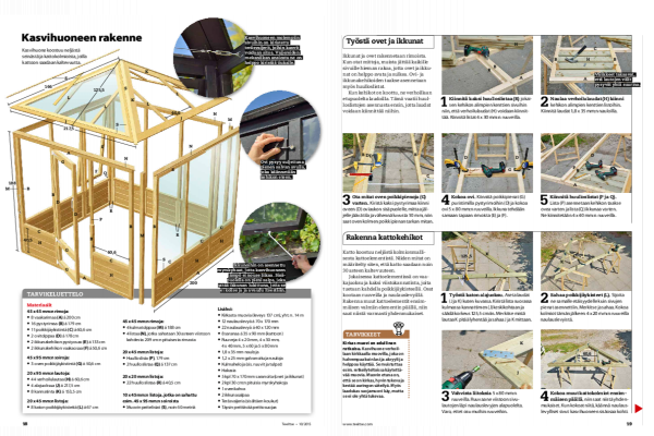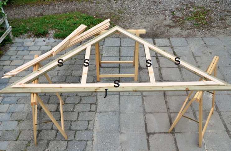 Jokaisessa kattoelementissä on vaa-kajuoksu ja kaksi viistokannatinta, joita tuetaan kahdella poikkijäykisteellä. Osat kootaan ruuveilla ja naulauslevyil lä. Rakenna muut kattoelementit ensim-mäisen valmiin elementin päällä, niin saat niistä varmasti yhdenmukaiset.