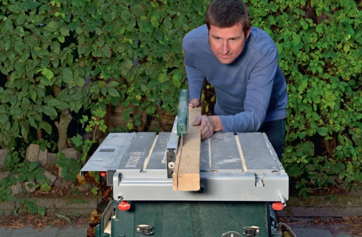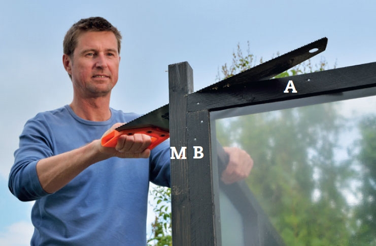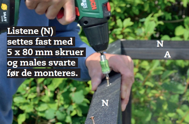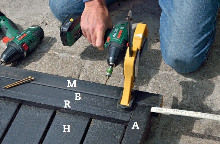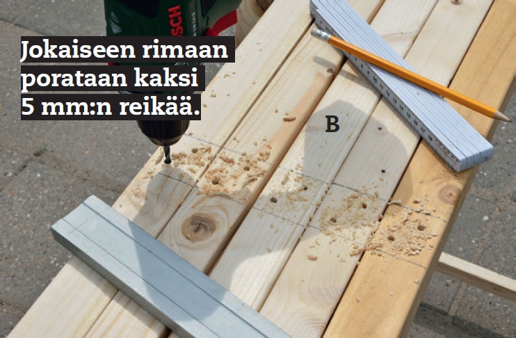 Ruuveille kannattaa esiporata reiät, ennen kuin kokoaa kehikot. Voit varmis-taa, että saat kaikki reiät samaan koh-taan kaikissa rimoissa asettamalla rimat vierekkäin, kun merkitset mittoja.