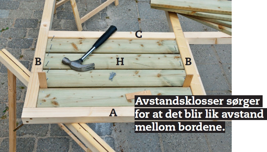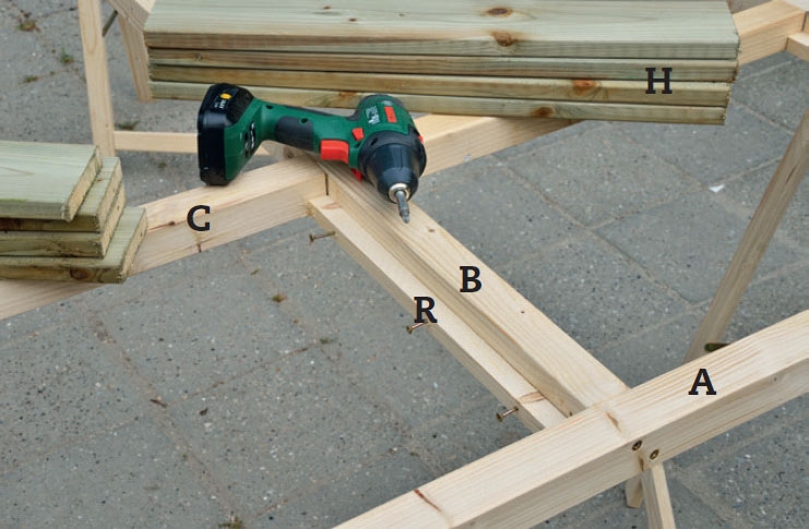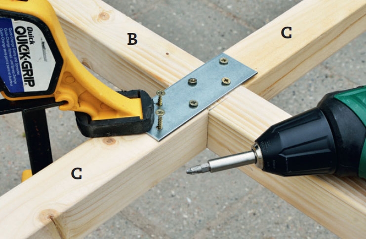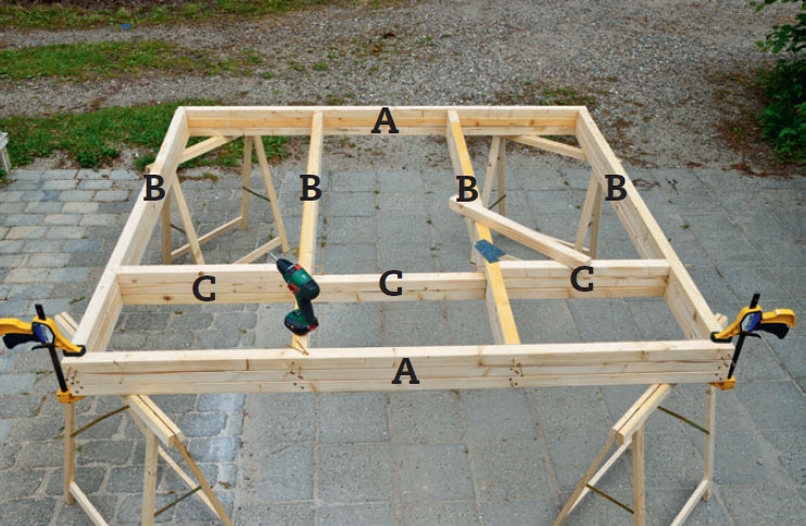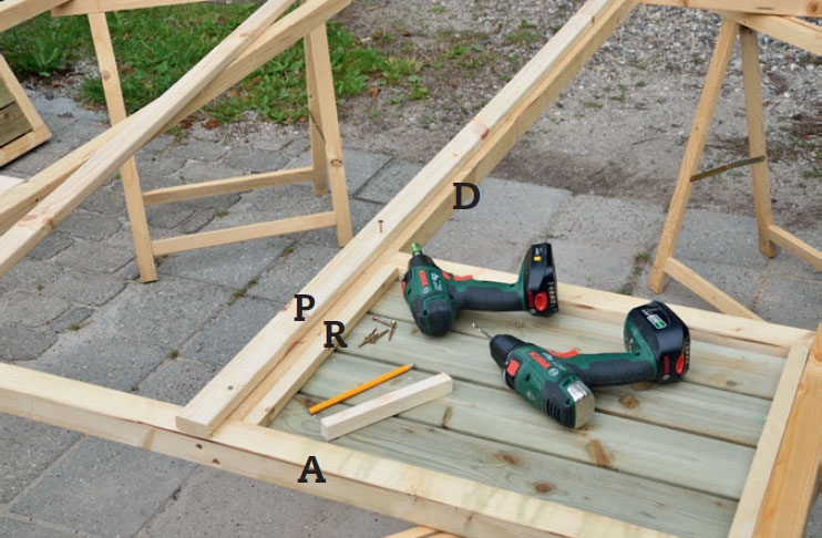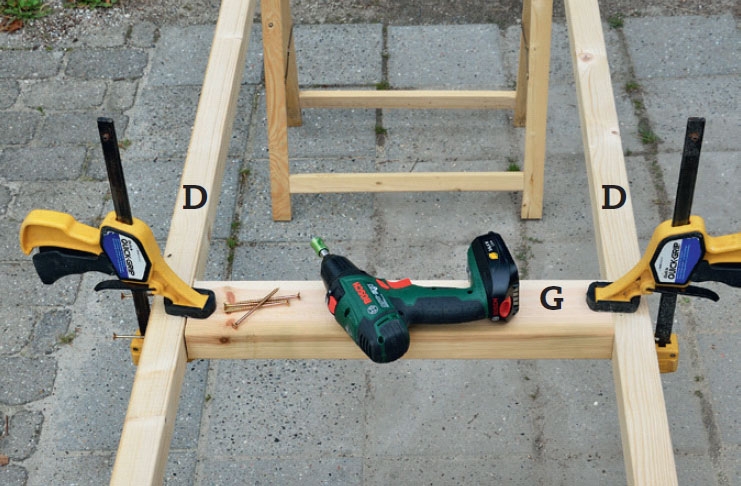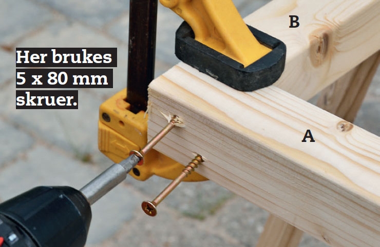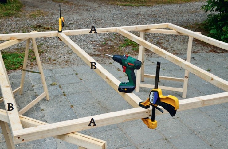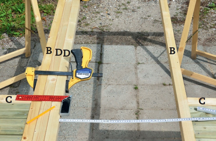 Kokoa rimat (A ja B) ruuveilla. Tämä sujuu helpoiten, jos asetat rimat pukkien päälle. Purista ne yhteen puristimilla, ennen kuin ruuvaat, niin saat rimat samaan tasoon.