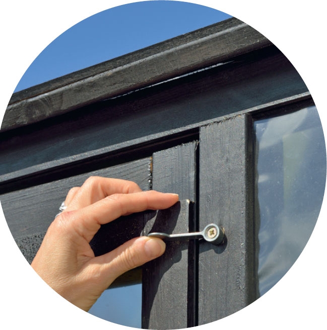 Ikkunat ja ovet rakennetaan rimoista. Kun otat mittoja, muista jättää kaikille sivuille hieman rakoa, jotta ovet ja ikku-nat on helppo avata ja sulkea. Ovi- ja ikkunakehikoiden taakse asennetaan myös huulloslistat.