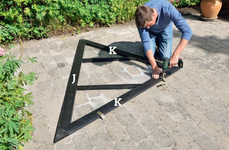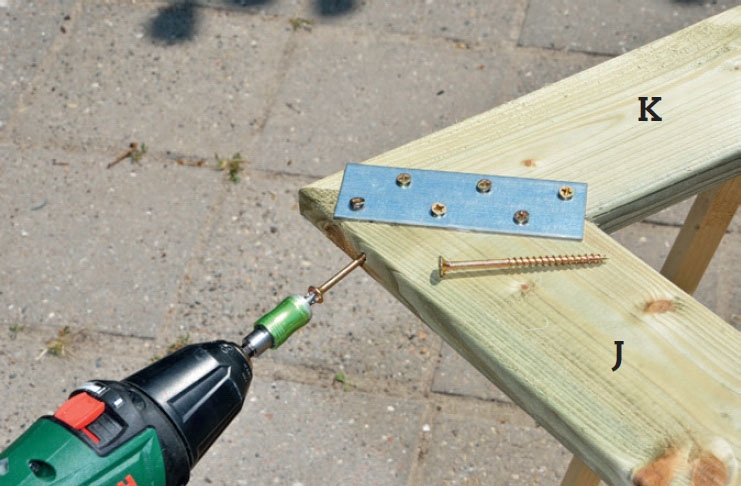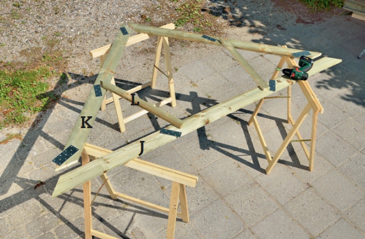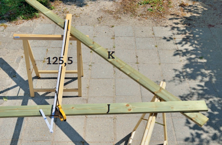 Työstä katon alajuoksu. Aseta laudat (J ja K) kuten kuvassa. Kiristä lista suorassa kulmassa kannattimen (J) keskikohtaan ja säädä korkeus 125,5 cm:iin. Merkitse mistä lautaa K pitää lyhentää ja sahaa J ja K mittaan.