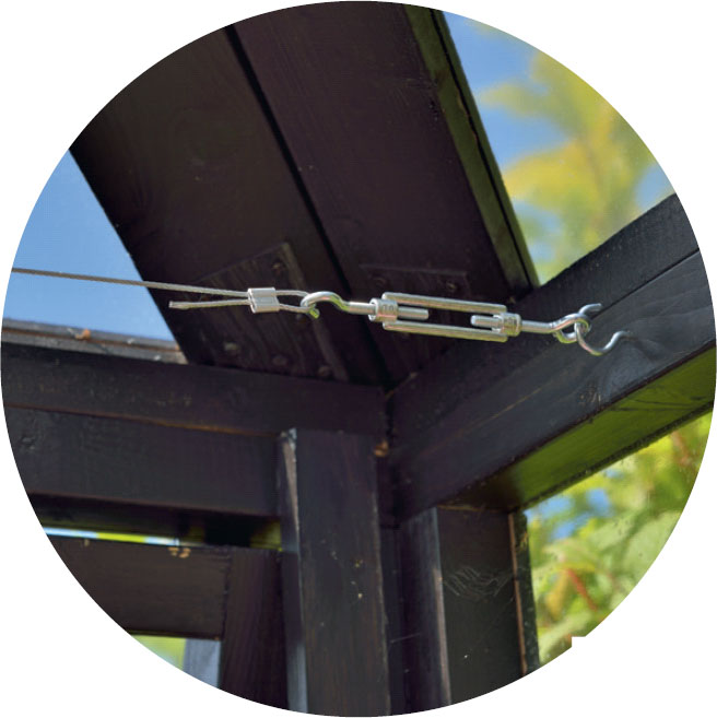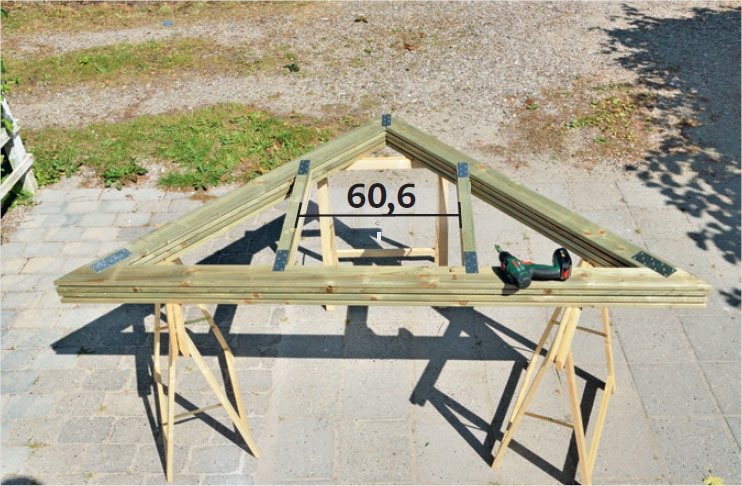 Kiinnitä ensimmäinen katto kehik-ko löysästi sivukehikkoon parilla pitkällä ruuvilla, joita ei ruuvata kokonaan sisään. Nosta kehikko ja kiinnitä se pitkään pyörötolppaan. Harjakorkeus on n. 247 cm.