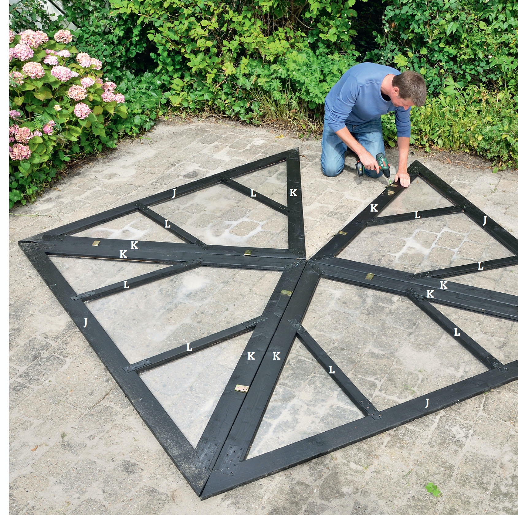 Yhdistä kattokehikot saranoilla. Se sujuu helpoiten, jos asetat kehikon osat maahan, kun kiinnität saranoita. Näin saat saranat tarkasti juuri oikeaan kohtaan.