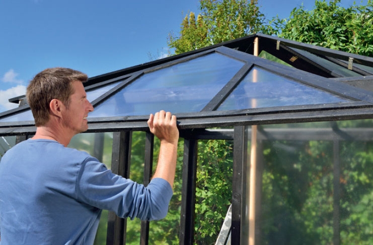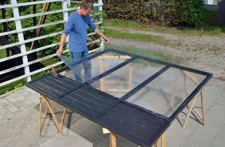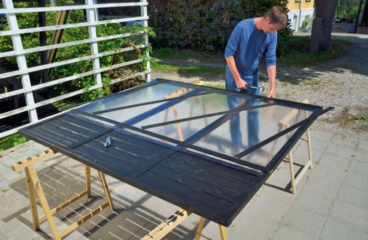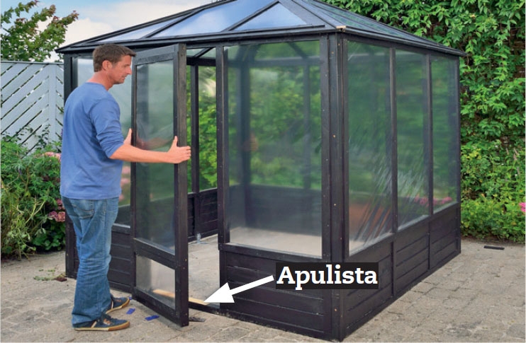 Asenna ovet ja ikkunat. Varmista, että niiden ympärille jää riittävästi tilaa, jotta ne saa helposti avattua ja suljettua. Asenna myös salvat ja ovenkahvat, jotta saat ovet kiinni. Sisusta kasvihuone lopuksi hyllyillä, kukkalaatikoilla, pöydillä ja tuoleilla - täysin oman tarpeesi mukaan.