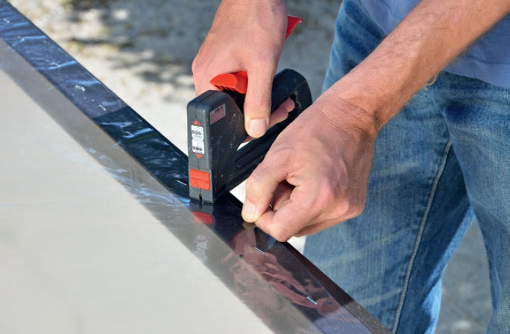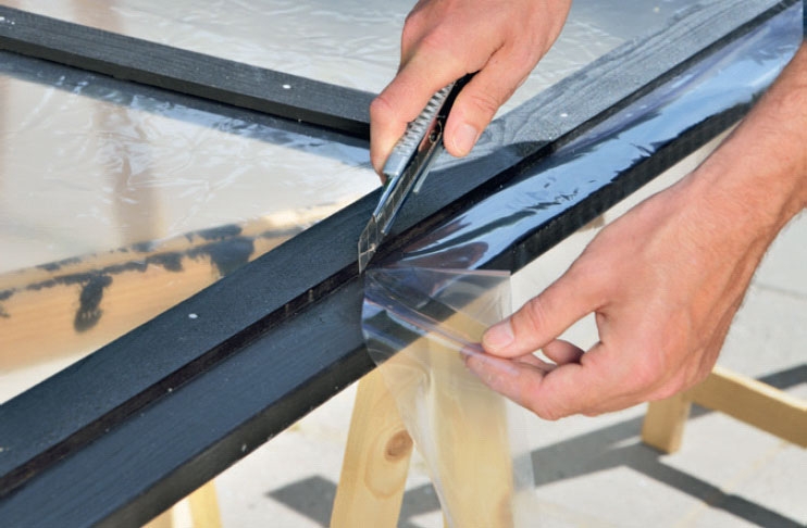 Asenna muovi. Kehikot on sovitettu muovin leveyteen, joten sitä tarvitsee lyhentää vain pituudesta. Leikkaa muovia taittoteräveitsellä.