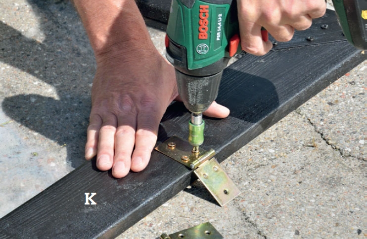 Sahaa poikkijäykisteet (L). Sijoita ne samalle etäisyydelle kuin sivujen pienat asennettiin. Merkitse ja sahaa. Kokoa kolmiot tämän jälkeen 4 x 20 mm:n ruuveilla naulauslevyistä.