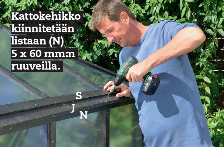 Asenna viimeinen kattokehikko paikalleen. Kiinnitä se kuten muutkin kehikot saranoihin ja seinäkehikon viistoon listaan (N) 5 x 60 mm:n ruuveilla.