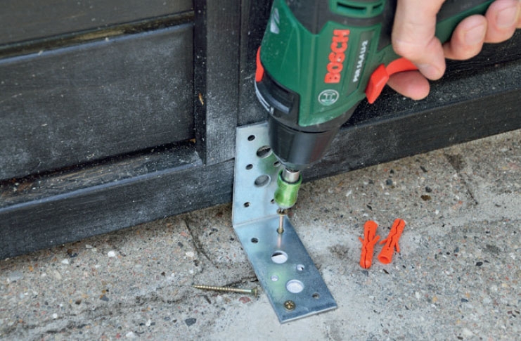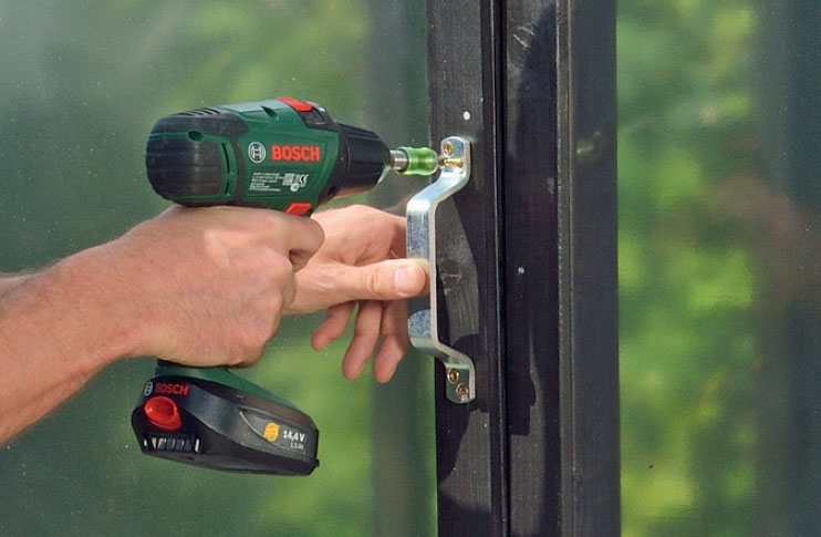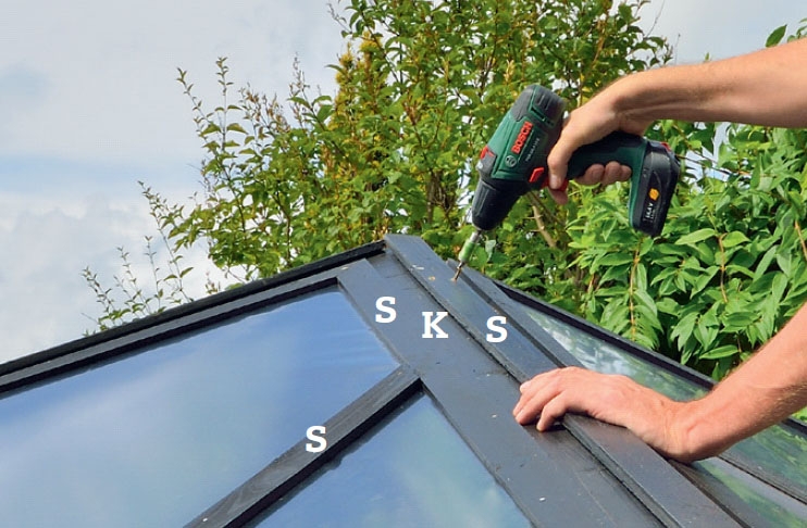 Kiinnitä kasvihuone alustaan. Tässä kiinnitämme kasvihuoneen laattoihin kulmaheloilla, ruuveilla ja tulpilla. Laattojen liikehdintään tarvitaan paljon voimaa, sillä ne ovat tiukasti kiinni toisissaan.