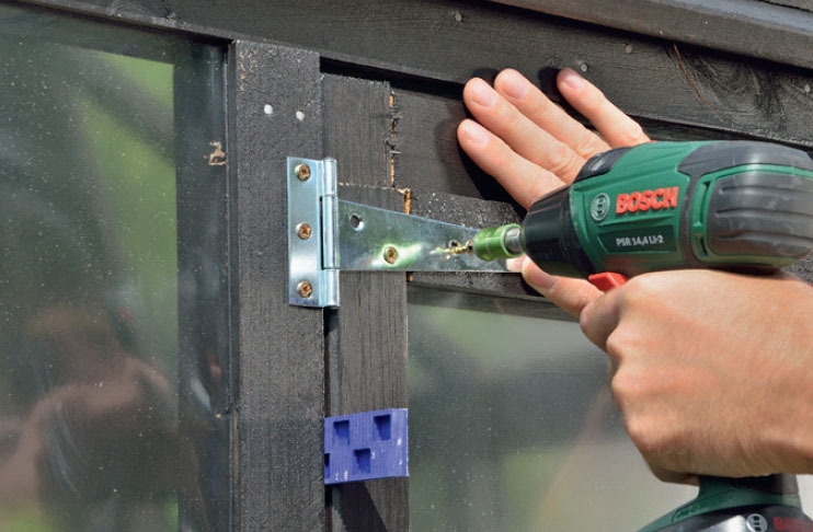 Kiinnitä saranat. Jokaiseen kehikkoon tulee kaksi saranaa, ja ne kiinnitetään 4 x 20 mm:n ruuveilla.