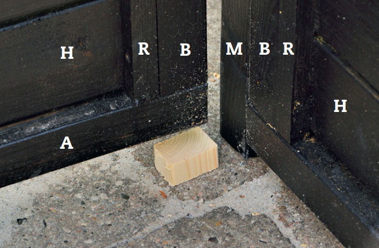 Tämä kulmatolppa (M) työntyy 20 mm seinäkehikon alareunan yli, koska alustassa on pieni painuma. Kiinnitä kulmatolppa (M) sivukehikkoon 5 x 80 mm:n ruuveilla.