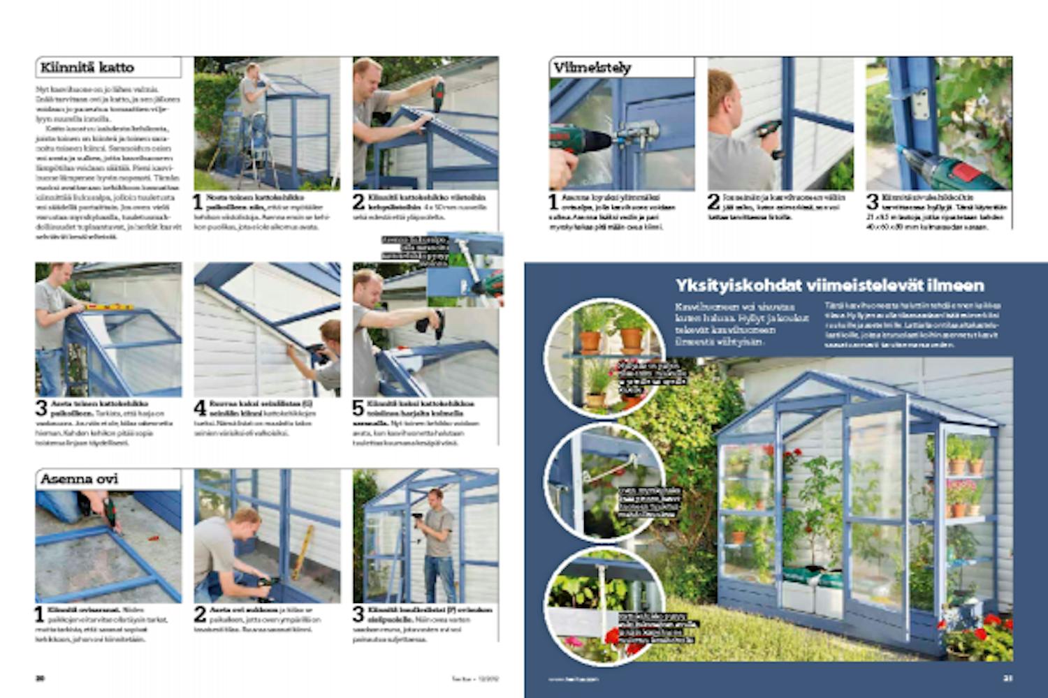 Kasvihuone koostuu kahdesta etusivun kehikosta, kahdesta sivukehikosta, yhdestä ovesta ja katosta. Ensin rakennetaan kehikot yksi kerralllaan, ja ne yhdistetään kokonaisuudeksi yksi kerrallaan. Kaikki kehikot maala-taan, ja lopuksi kokonaisuus kootaan yhdeksi rakenteeksi.