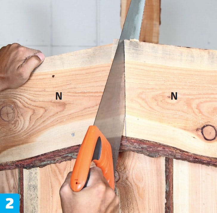 Sahaa otsalaudat käsisahalla. Ota hyvä asento ja keskity, jotta saumasta tulee siisti. Irrota ruuvit ja paina laudat tiiviisti toisiaan vasten. Ruuvaa otsalaudat kiinni 70 millin ruuveilla noin 45 sentin välein.