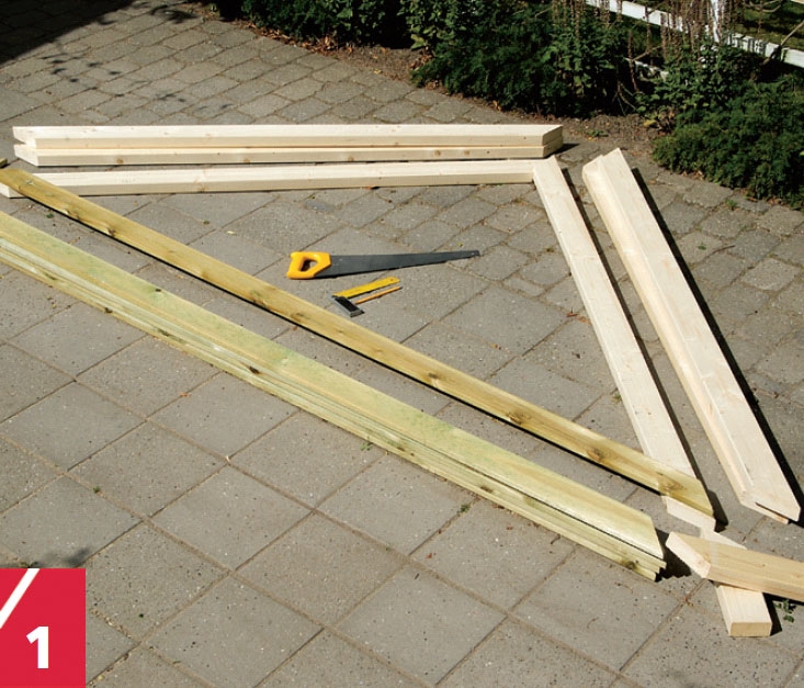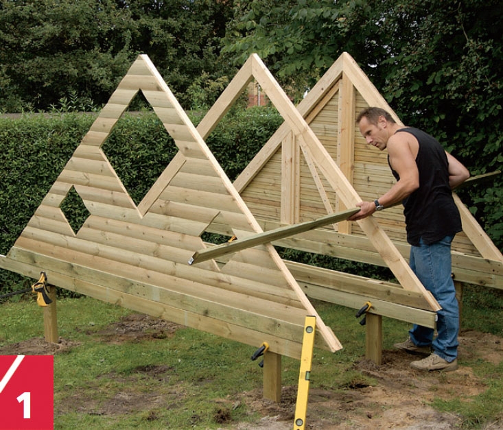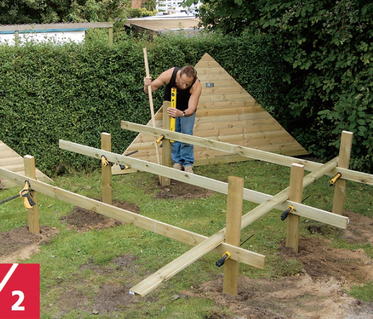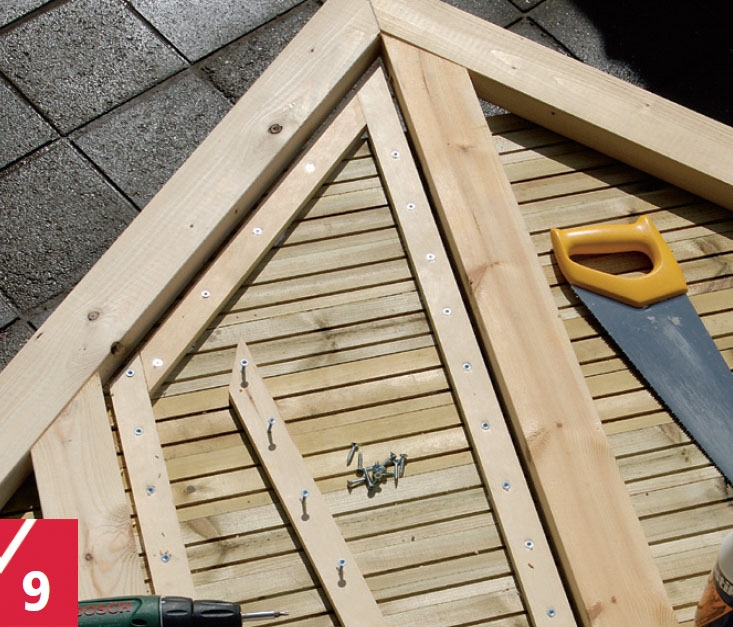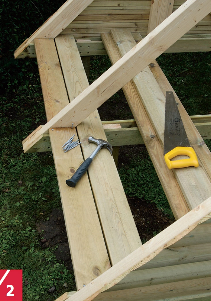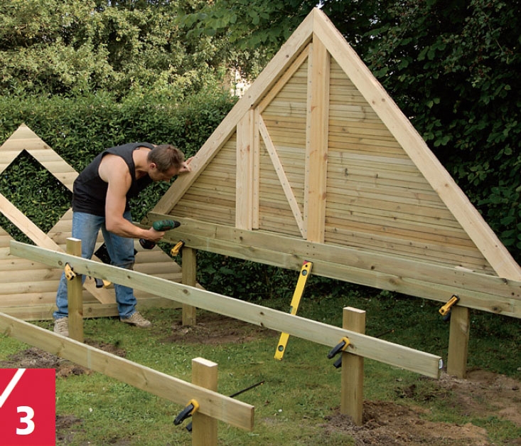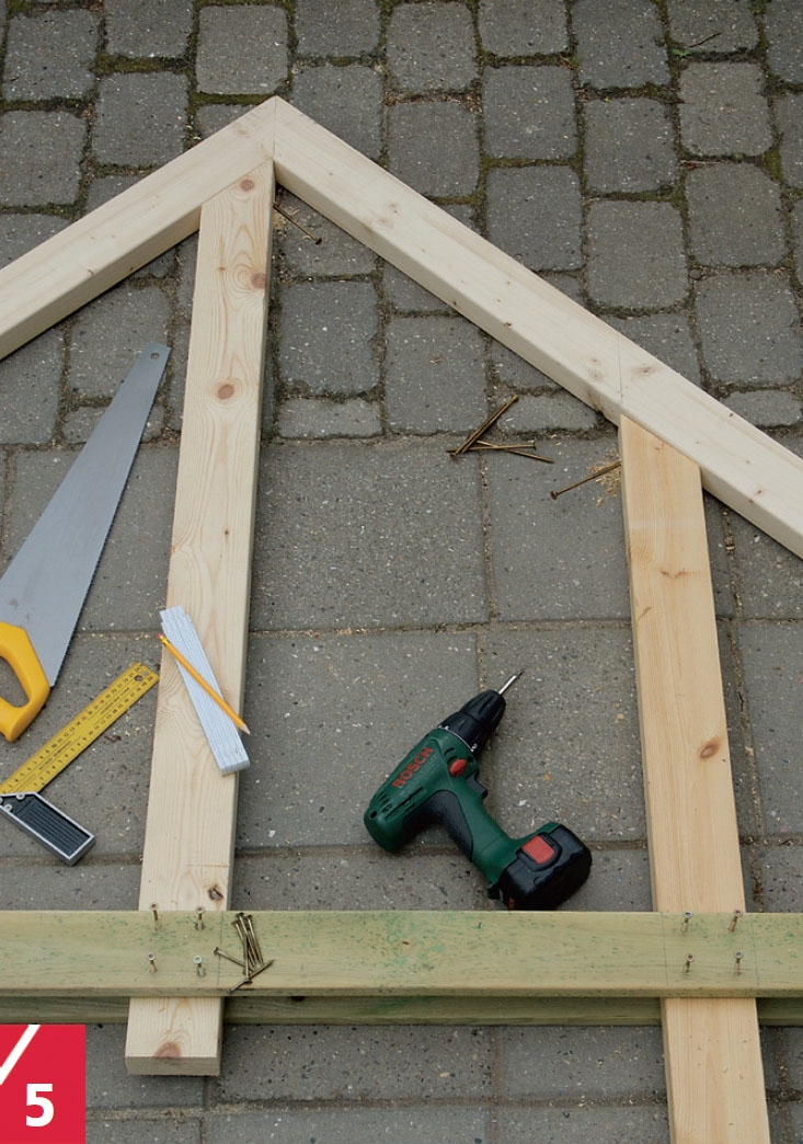 Tarkista oikolaudalla, että keskimmäinen kattokannatin on samalla korkeudella päätyjen kanssa. Jos teet katosta pitemmän kuin kuvissamme, sijoita päätyjen väliin kattokannattimia noin metrin välein. Silloin katto on tukeva ja koko rakenne vankka.