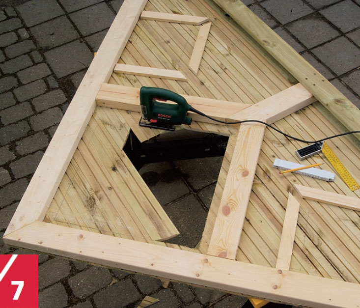 Oviaukon pielet tehdään samalla tavalla. Voit jättää lankut (D) ja (E) pistämään alas kaksiosaisen alapaarteen välistä ja katkaista ne mittoihinsa kiinnityksen jälkeen.