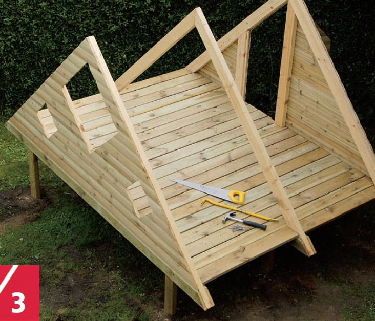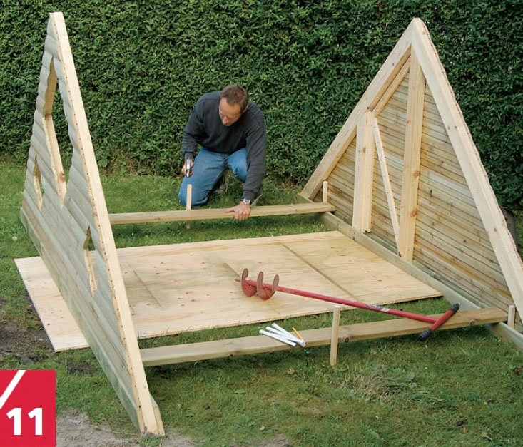 Seuraavaksi pilarit, lattia ja mökin kokoaminen