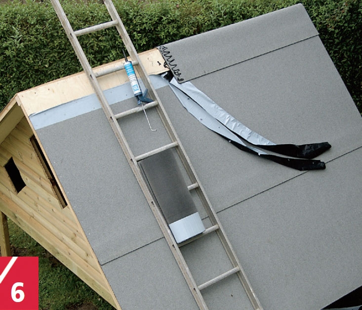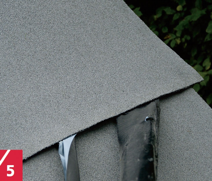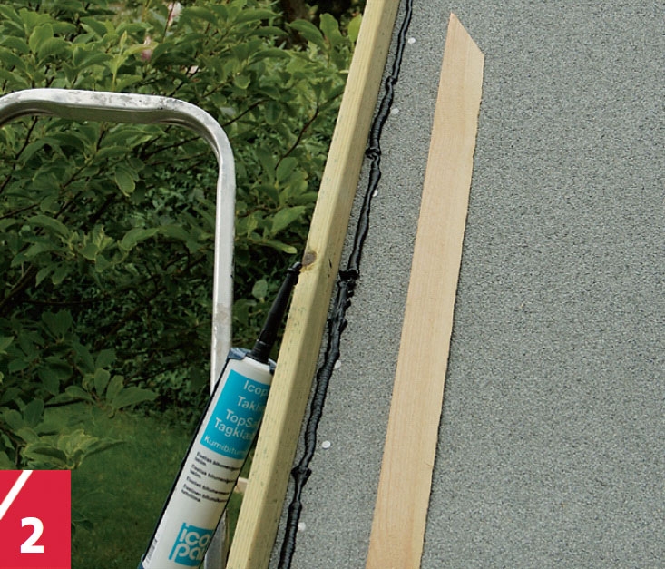 Levitä reilusti bitumiliimaa räystäslauto-jen ja katon väliseen kulmaan. Yritä peittää massalla kaikki naulanpäät. Paina kolmio-rimat kittiin ja naulaa ne räystäslautaan sekä kattolevyn läpi räystään jäykistelistaan.