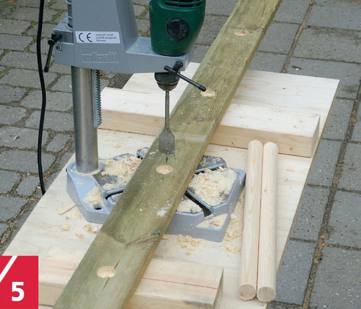 Sijoita tikkaiden puolat noin 30 cm päähän toisistaan. Poraa sivulautoihin 10 mm upotukset 27 mm poralla. Naputa puolat koloihin, joihin on hyvä pursottaa ensin hieman PU-liimaa.