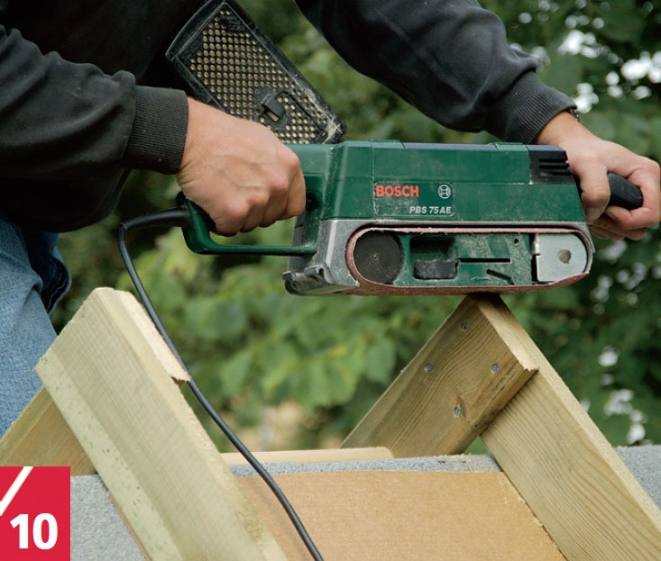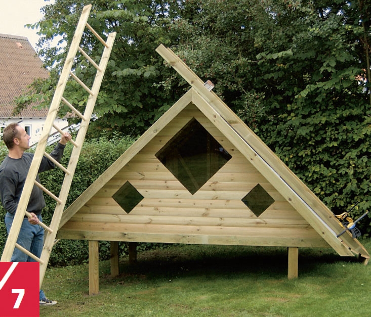 Kiinnitä tikkaat liukumäkeen 40 mm yleisruuveilla. Sahaa tikkaiden ja liukumäen sivulaudat toistensa yläsyrjiä pitkin poikki.