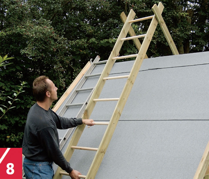 Seuraava kermikaista levitetään ja nau-lataan yläreunasta kiinni. Kermin päät liima-taan räystäisiin bitumiliimalla. Poista sitten kermin liimareunaa suojaava kelmu. Paina tiukasti edellisen kermin yläreunaan. Naulaa kermin yläreuna lopullisesti kiinni.