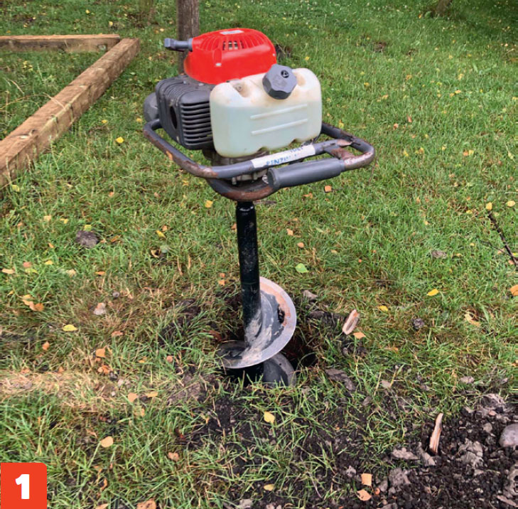 Kaiva kuopat nurkkatolpille (A). Tässä käytetään moottorikairaa, mutta voit tehdä kuopat myös käsin väännettävällä kairalla tai lapiolla. Tee kuopista noin metrin syvyiset.