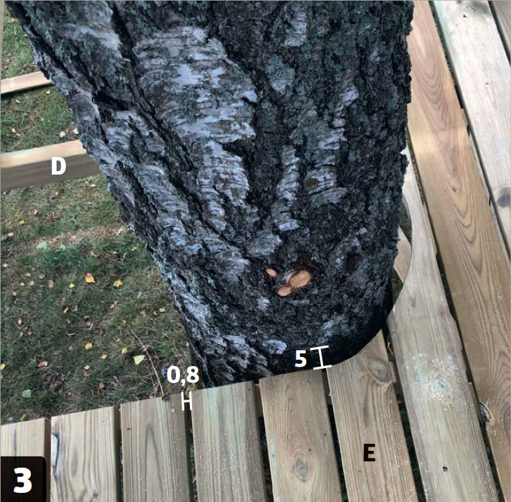 Maja rakennetaan puunrungon ympärille, joka jää runkolankkujen väliin. Jätä rungon ja lattian väliin noin viiden sentin rako, jotta puu mahtuu heilumaan tuulella.