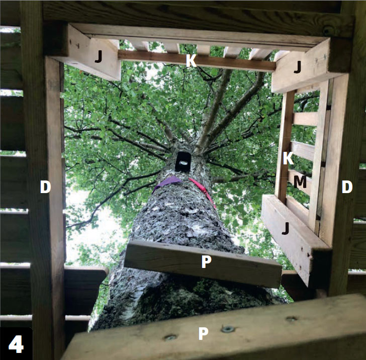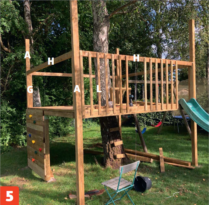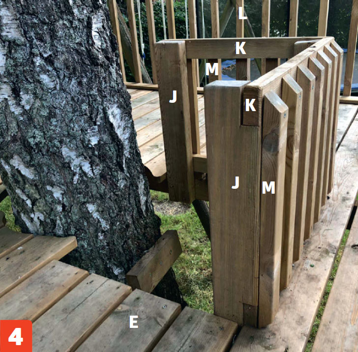 Ruuvaa kolme lyhyttä tolppaa (J) kiinni lattiassa olevaan reikään. Kiinnitä tolpat lankkuihin (D) ja tee niihin kaiteet laudoista (K ja M), jotta lapset eivät putoa vahingossa porrasaukkoon.
