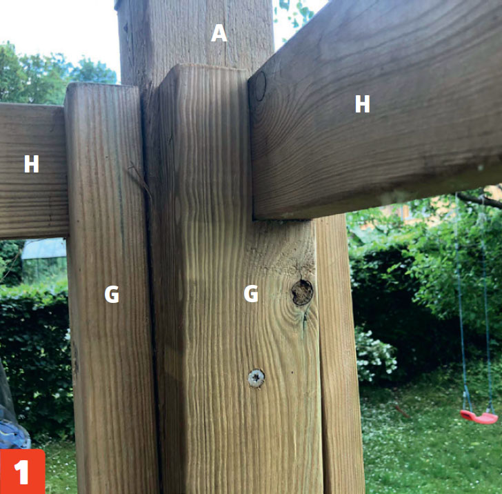 Rakenna kaide majan reunoille. Sahaa kahdeksan tolppaa (G), tee niiden päihin lovet ja ruuvaa ne kiinni nurkkatolppiin (A). Sahaa kaiteen ylälankut (H), asenna ne loviin ja ruuvaa ne kiinni.