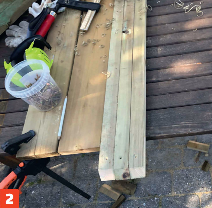 Sahaa terassilaudat rimoiksi (L ja M). Halkaise kaikki laudat pitkittäin kolmeen osaan pöytäsirkkelillä. Poraa ruuveille valmiit asennusreiät terällä, jossa on upottaja.