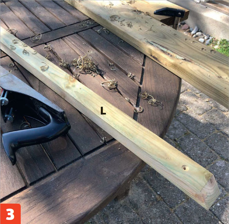 Sahaa rimat (L ja M) 45 asteen kulmassa, jotta vesi valuu nopeasti maahan. Höylää rimojen pitkät reunat kevyesti, jotta lapset eivät saa tikkuja sormiinsa.
