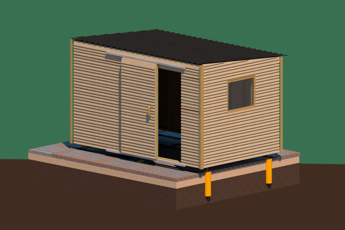 3. Kallis: eristetty vaja Superwood- laudoista huopakatolla, ikkunoilla ja ovella