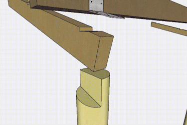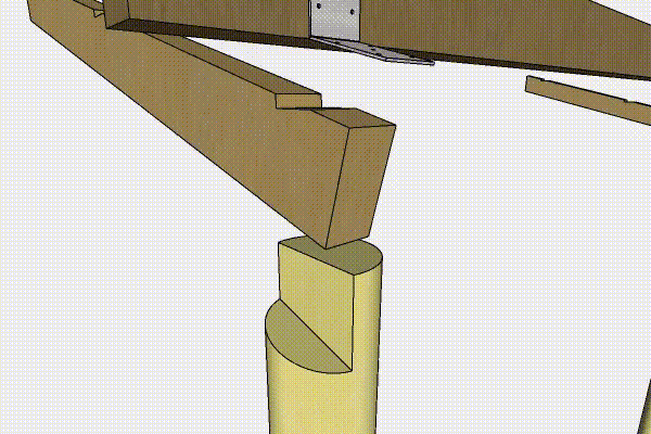 Merkitse palkkien paikat katokseen. Jännitä palkit (K) tolppien (B ja C) sivuille sopivaan kulmaan parilla ruuvipuristimella. Merkitse tolppiin paikat sekä ulko- että sisäpuolelle.