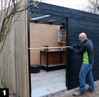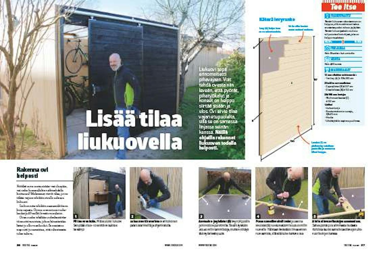 Liukuovesta tehdään samannäköinen kuin vajasta. Oveen asennetaan vaakalaudat ja 40 milliä leveät reunalistat.
